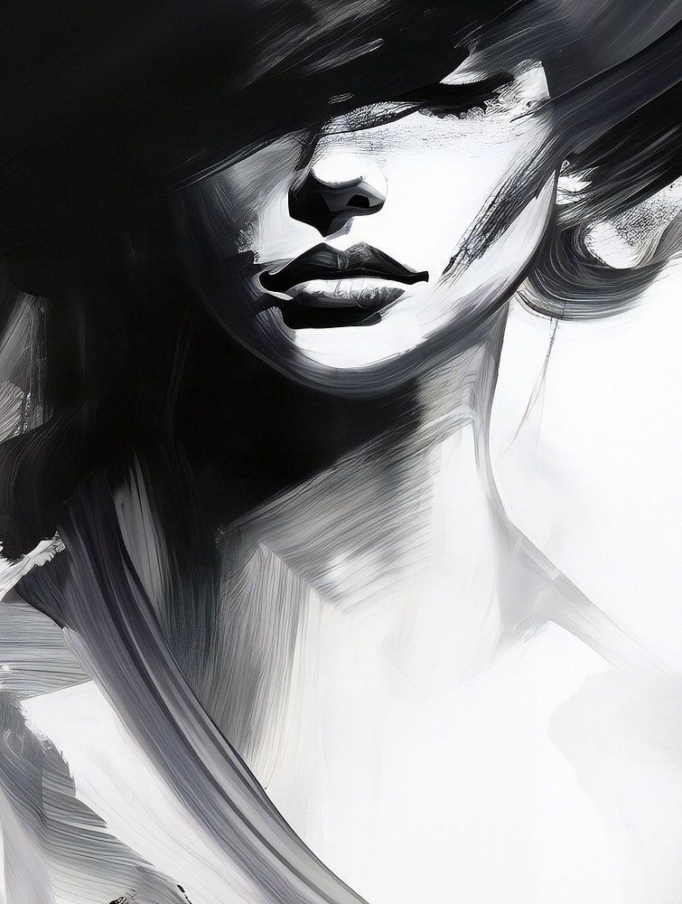 Abstrakte Illustration mit dem Porträt einer Frau in Schwarz-Weiß- und Grautönen mit groben Pinselstrichen auf Papier.