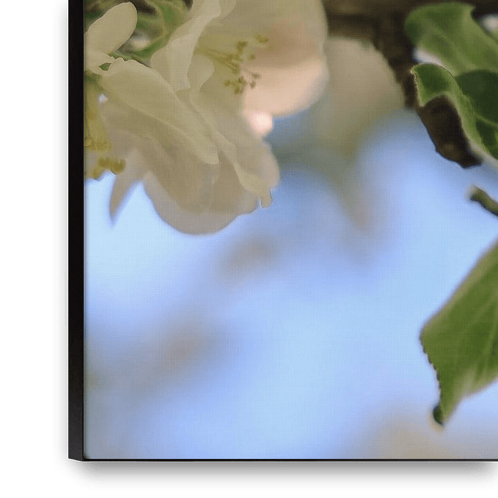 Bestelle das Foto Apfelblütenzweig mit Biene von BlattArt - Christine Horn als Reproduktion auf Leinwand, Alu-Dibond, als Poster, Fototapete oder Acrylglasbild.