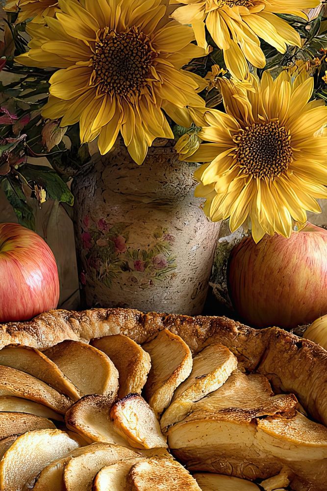 Apfelkuchen mit Sonnenblumen und Äpfeln – warmes Herbststillleben