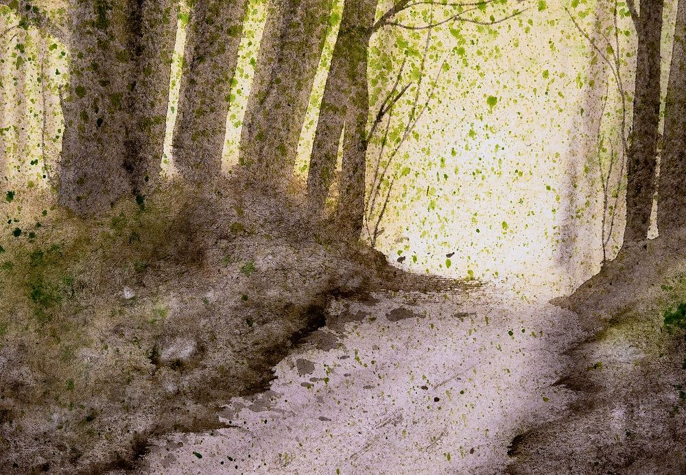 Aquarell oder Aquarellmalerei einer Landschaft mit Bäumen, durch die ein Fußweg führt. Im Hintergrund ist warmes Sonnenlicht zu sehen.