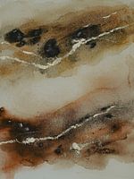 Abstrakte Aquarell- oder Wasserfarbenmalerei. Sie besteht aus Streifen in verschiedenen Beige- und Brauntönen und einigen goldenen Maserungen.