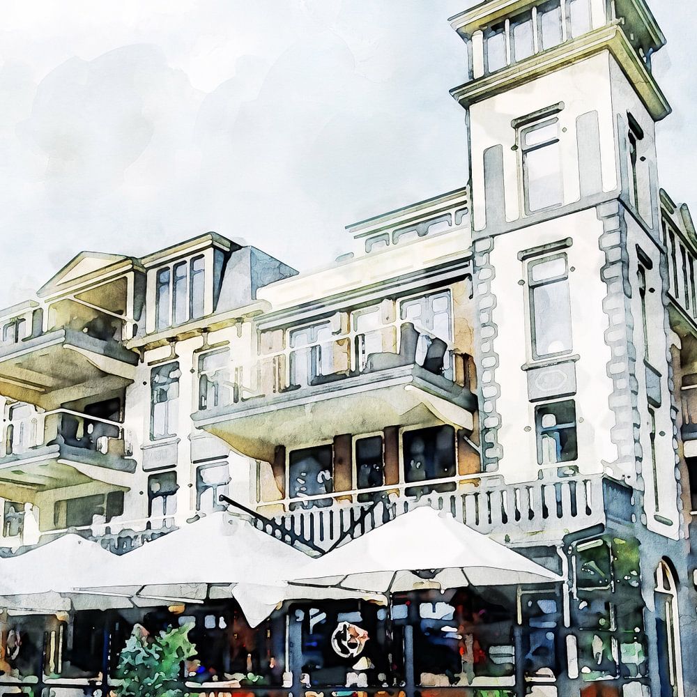 Aquarell des Komplexes 't Groentje in Domburg, Zeeland. Es ist ikonisch für den Platz 't Groentje, wo die Büste von Doktor Mesger steht. Dieser Amsterdamer Arzt legte dort den Grundstein dafür, dass Domburg zu einem Badeort wurde. Zu seinen Patienten gehörte die Oberschicht aus ganz Europa.