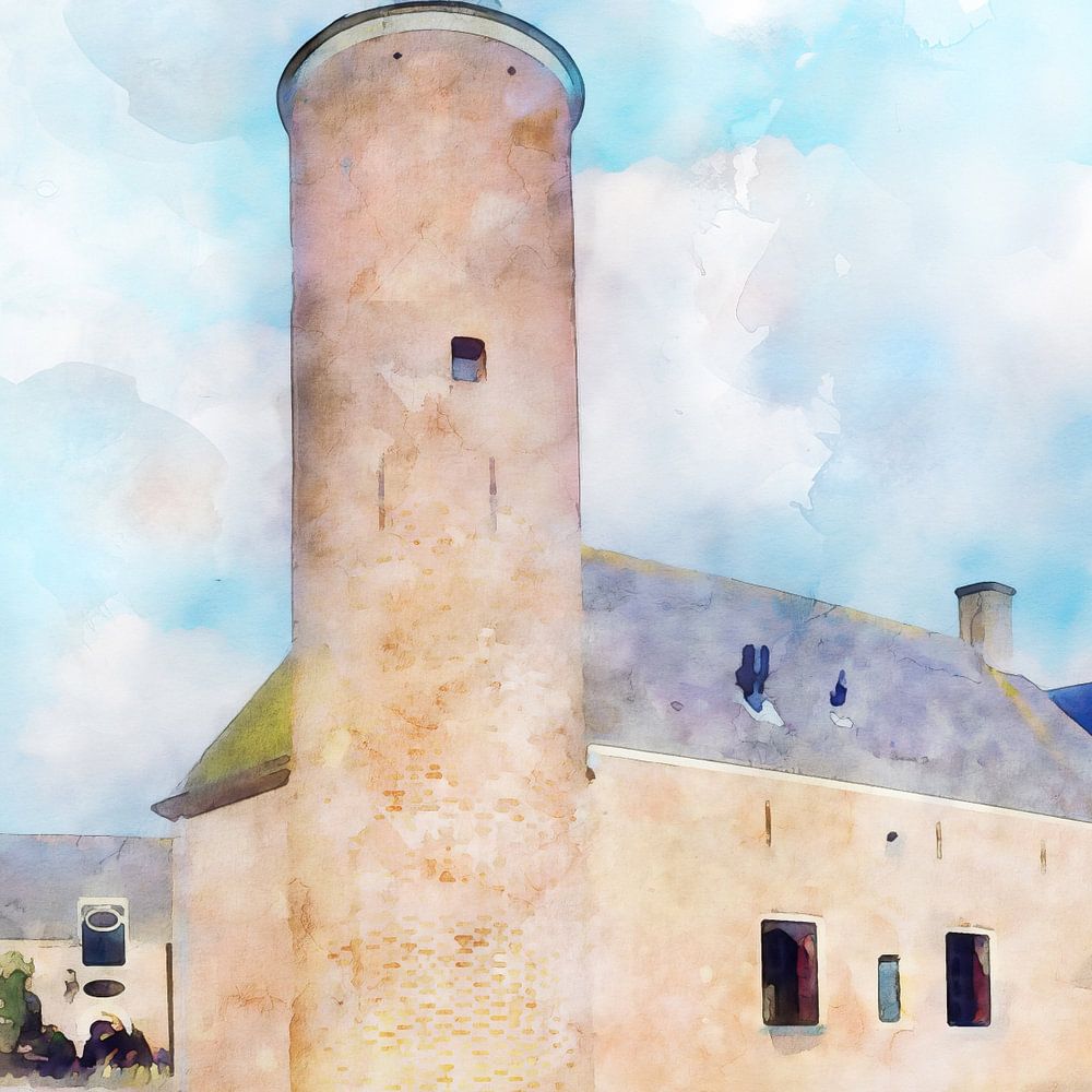 Ein Aquarell des Schlosses Westhove im Naturschutzgebiet De Manteling in der Gemeinde Veere, Zeeland. Dieses Schloss wurde bereits 1277 als Eigentum der Abtei in Middelburg erwähnt. Das Schloss ist weitgehend zugänglich.
