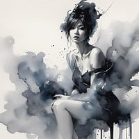 Eine schöne, sexy Frau, die ein Chiffonkleid trägt und ihr Haar zu einem Dutt hochgesteckt hat. Die Frau hat ein asiatisches Aussehen. Das Bild wurde mit ai erstellt.