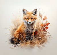 Aquarell eines Fuchswelpen inmitten von altem, trockenem, hohem Gras.