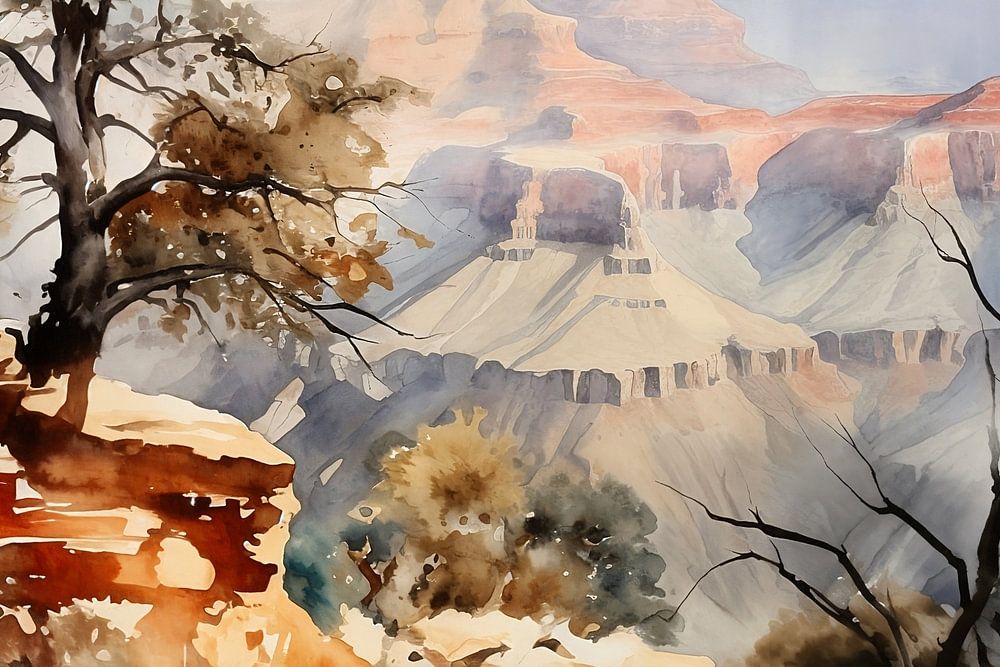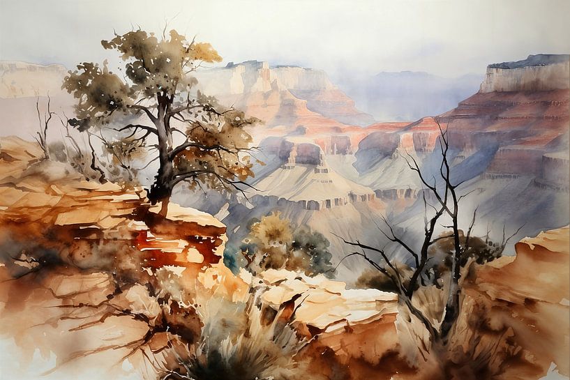 Bestelle dieses Landschafts-Wandbild Aquarelle Landschaft Grand Canyon von NJ Midnight Studio als Reproduktion auf Leinwand, Alu-Dibond, als Poster, Fototapete oder Acrylglasbild.