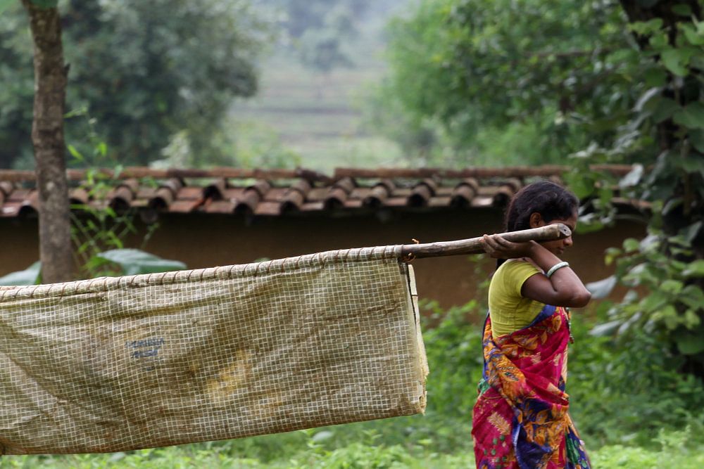 Frauen Gemüse aus dem Garten auf der "tragbaren" trägt. Mit den beiden Bären viel einfacher und leichter. Madhya Pradesh, Indien.