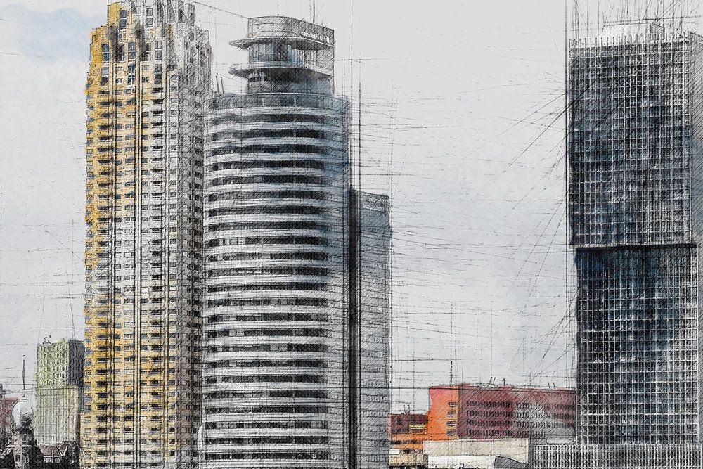 Digitale Architekturskizze von De Rotterdam und anderen angrenzenden Wolkenkratzern in Rotterdam. Die Gebäude prägen heute die Skyline der Maas-Metropole.