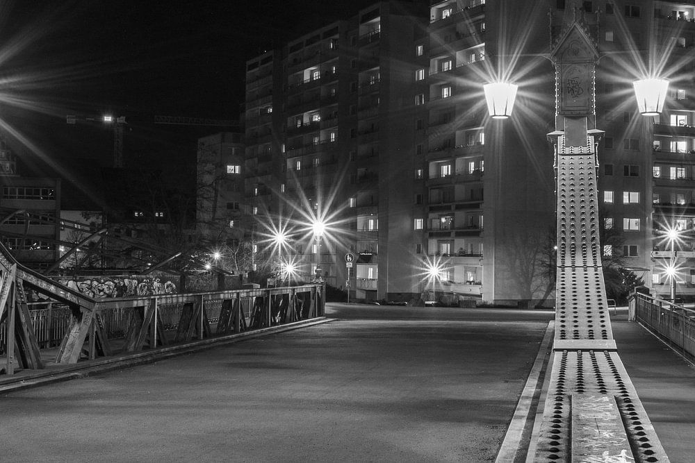 Architektur Die Paradiesbrücke über den Fluss Mulde in Zwickau Sachsen Ostdeutschland bei Nacht Schwarz-Weiß-Fotografie