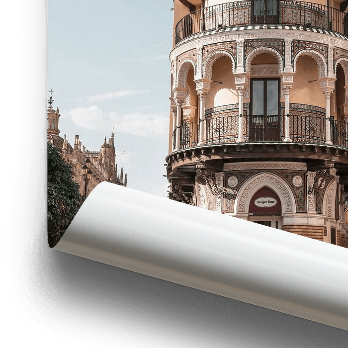 Bestelle das Foto Architektur in Sevilla | Edificio La Adriática | Städtereise von Laura Dijkslag als Reproduktion auf Leinwand, Alu-Dibond, als Poster, Fototapete oder Acrylglasbild.