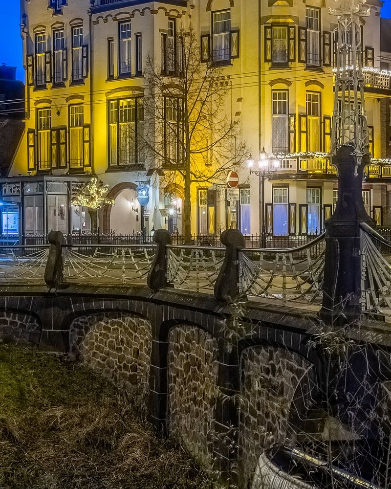 Der berühmte Wasserfall und Blick auf das beleuchtete Hotel Molendal, eine ehemalige Jugendstil-Stadtvilla.