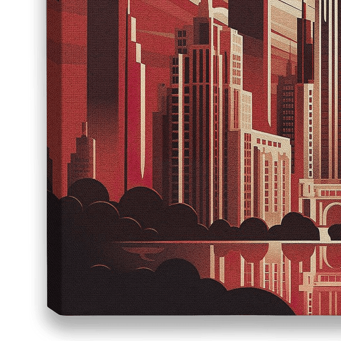 Art Deco Metropolis ist ein digitales Gemälde einer modernen Stadt, inspiriert durch den deutschen Film Metropolis von 1927. Die Arbeit gibt einen eleganten Blick auf Ihr Interieur!