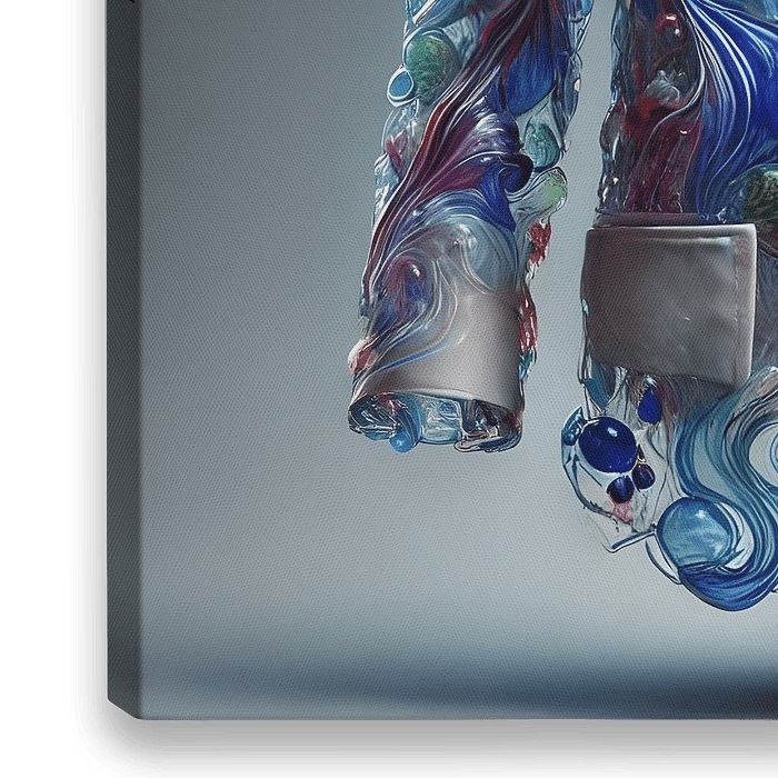 Das Kunstwerk zeigt ein surreales Design eines Arztkittels. Der Kittel besteht aus transparentem, glänzendem Material, in dem lebhafte, bunte Wirbel in Blau-, Grün- und Rottönen zu sehen sind. Der Kragen und die Kanten des Kittels sind in klassischem Weiß gehalten, das einen eleganten Kontrast zu dem bunten Muster bildet.