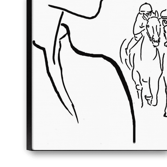 Auf meiner Pinselzeichnung habe ich beide Attraktionen zusammengeführt. Eine wohlbehütete Dame schaut dem Pferderennen zu.  Die Dame selbst mit wenigen, kräftigen Pinselstrichen aufs Papier gebannt. Die Galopper mit feinerem Pinsel und detaillierter ausgearbeitet, um die Geschwindigkeit ihrer Bewegungen im Kontrast zum ruhigen Gesicht zu verdeutlichen.