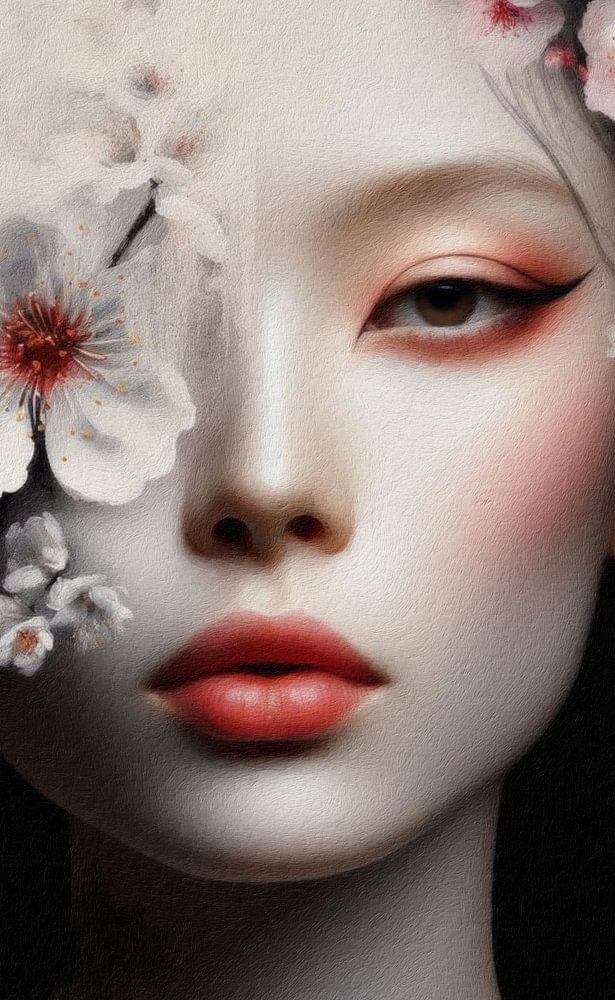 Das Bild kombiniert ihre zarte Schönheit mit der Vergänglichkeit von Kirschblüten. Der aquarellartige Stil und die subtilen Farbübergänge verleihen dem Werk eine weiche und ätherische Note, während die scharfen Linien ihrer Augen und Lippen einen faszinierenden Kontrast bilden.