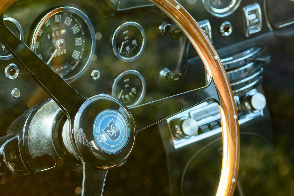 Aston Martin DB5 klassischer britischer Grand Tourer Sportwagen Interieur entworfen von dem italienischen Karosseriebauer Carrozzeria Touring Superleggera.