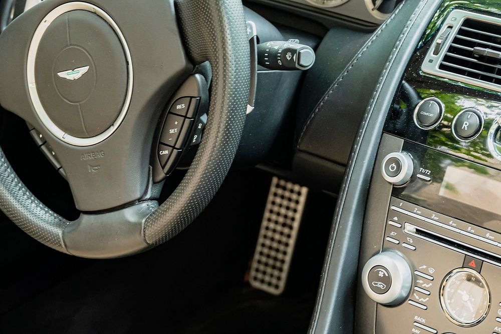 Aston Martin V8 Vantage Roadster Cabrio-Sportwagen-Interieur. Das Interieur des Aston Martin V8 Vantage Roadster verbindet britische Handwerkskunst mit einer sportlich-eleganten Ästhetik, die auf ein intensives Fahrerlebnis zugeschnitten ist. Das Armaturenbrett des V8 Vantage Roadster ist eine nahtlose Mischung aus Luxus und Sportlichkeit, mit einem auf den Fahrer ausgerichteten Layout und hochwertigen Materialien.