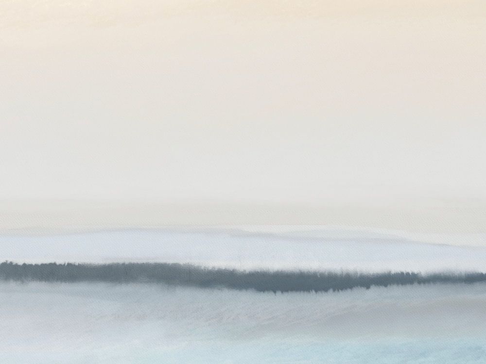 Abstrakt minimalistisches Landschaftsbild mit sanften Farbtönen in blau und grün. Aquarell auf Papier.