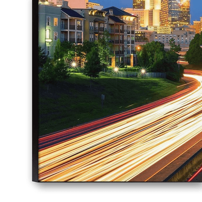 Die blaue Stunde legt sich über Atlanta, während die Türme vor einem kobaltblauen Himmel leuchten. Von der Jackson-Street-Brücke aus ziehen Bänder aus Scheinwerfern und Rücklichtern in Richtung Stadtzentrum und zeichnen elegante Kurven, die das Auge durch die Szene führen. Ein klarer Mond steht über der Skyline, und kleine Baumgruppen entlang der Fahrbahn mildern Stahl und Glas ab. Man kann fast das Summen der Stadt hören, wenn der Tag dem Abend weicht.