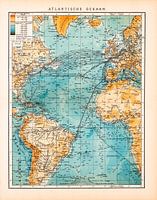 Diese antike Karte aus der Zeit um 1900 zeigt den Atlantischen Ozean. Eine Legende mit Höhen- und Tiefengürtel ist enthalten. Die Karte ist in Farbe.