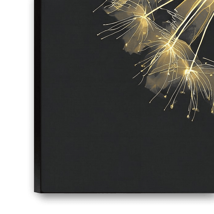 Dieses Kunstwerk mit seinen filigranen Details und dem leuchtenden, goldenen Samenflaum bildet einen schönen Kontrast zum anthrazit-schwarzen Hintergrund. Es fängt den zarten Moment eines vom Wind verwehten Wunsches ein und symbolisiert Hoffnung, Freiheit und die Schönheit des Vergänglichen.