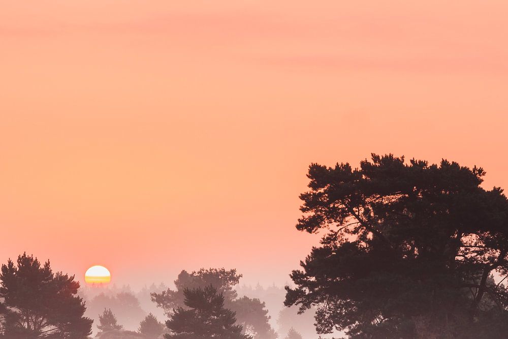 So schön sind sie, diese frühen Morgenstunden, wenn das Heidekraut blüht und die Sonne über einer nebligen Landschaft aufgeht. Der Himmel ist farbig und langsam tauchen die Bäume auf, als die Sonne durch den Nebel zu scheinen beginnt.