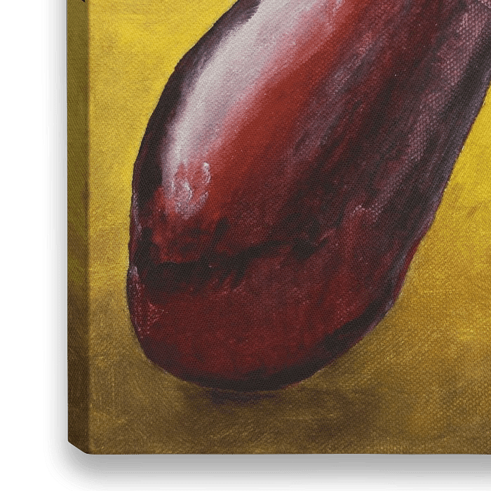 Dieses Stillleben zeigt zwei Auberginen, die mit kräftigen Pinselstrichen und leuchtenden Farben auf Leinwand gebracht wurden. Die dunklen, violetten Schalen glänzen im Licht und bilden einen spannenden Kontrast zum warmen, goldgelben Hintergrund. Die Komposition ist bewusst schlicht gehalten, um die natürliche Schönheit und die…