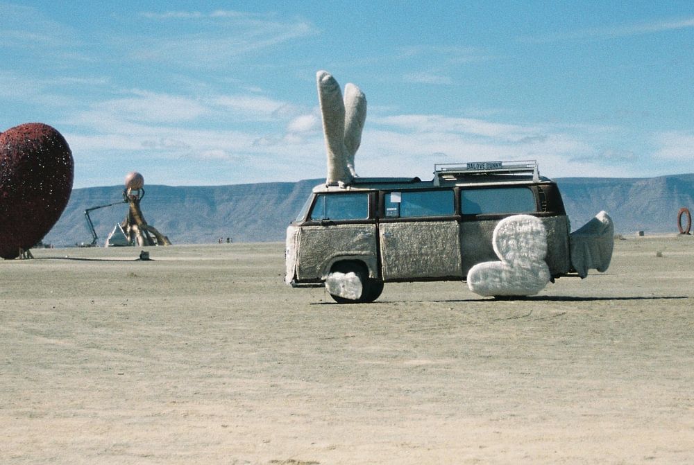 Dieses Foto zeigt die Landschaft bei einem dynamischen Festival, das jährlich in der südafrikanischen Karoo stattfindet. Mehr als 10.000 Menschen nehmen an diesem Festival teil und sind 7 Tage lang Selbstversorger in der Wüste. Ein paar Tage hier zu verbringen ist atemberaubend, und das Festivalgelände ist voll von einzigartigen Kunstwerken. Dieses Foto wurde bei einem langen Spaziergang über das Festivalgelände von Afrikaburn 2023 aufgenommen.