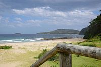 Auf dem Weg zum Strand von Pebbly Beach, New South Wales, Australien. Es handelt sich um einen kleinen Sandstrand, der mit großen, verstreuten Kieselsteinen bedeckt ist und an beiden Enden von größeren Felsformationen gesäumt wird. Er hat zwar keinen langen, goldenen Sandstrand, aber er hat eine ganz eigene natürliche Schönheit. Der…