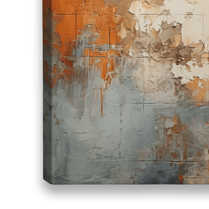 Alles liegt im Detail. Detailliertes Rendering eines verwitterten Bildes in Rostbraun, Sandfarbe und Hellblau. Wählen Sie Ihre eigene Größe und Material mit dieser Arbeit.