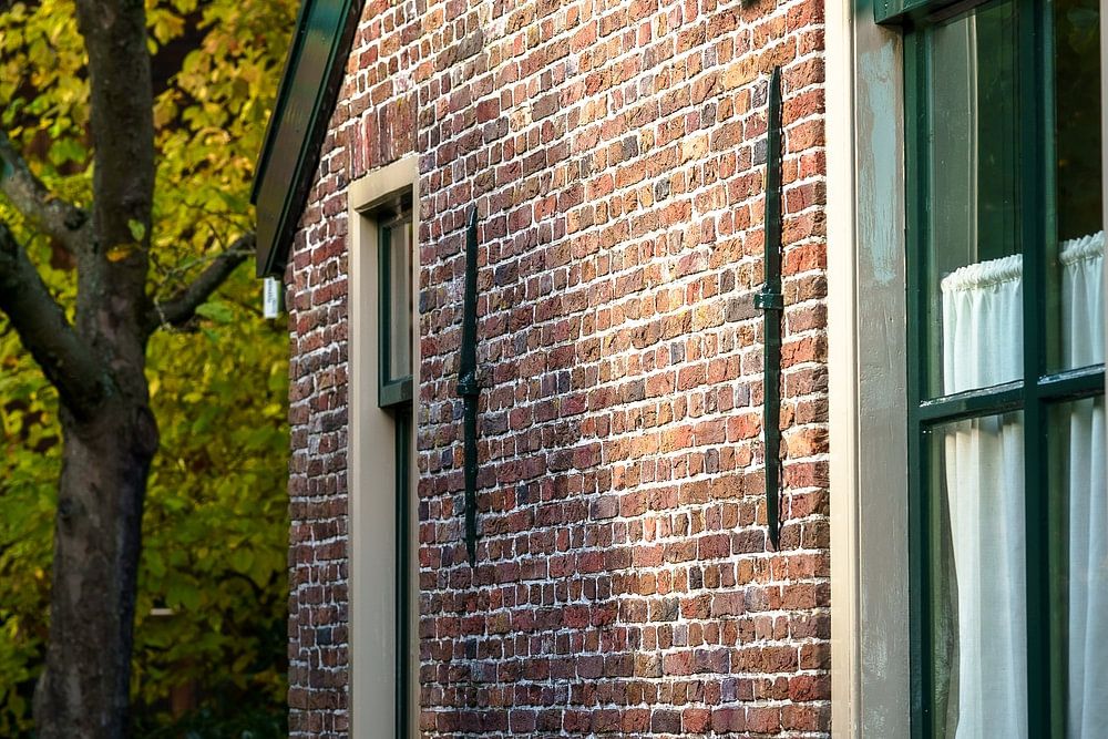Ein wunderschöner, stimmungsvoller Ausblick in einem Garten mit Obstgarten auf einem kulturhistorischen Bauernhof in einem Freilichtmuseum der niederländischen Landarchitektur. Foto mit ländlichem Charakter und stimmungsvollem Licht auf einer Fassade mit authentischen Ziegeln.