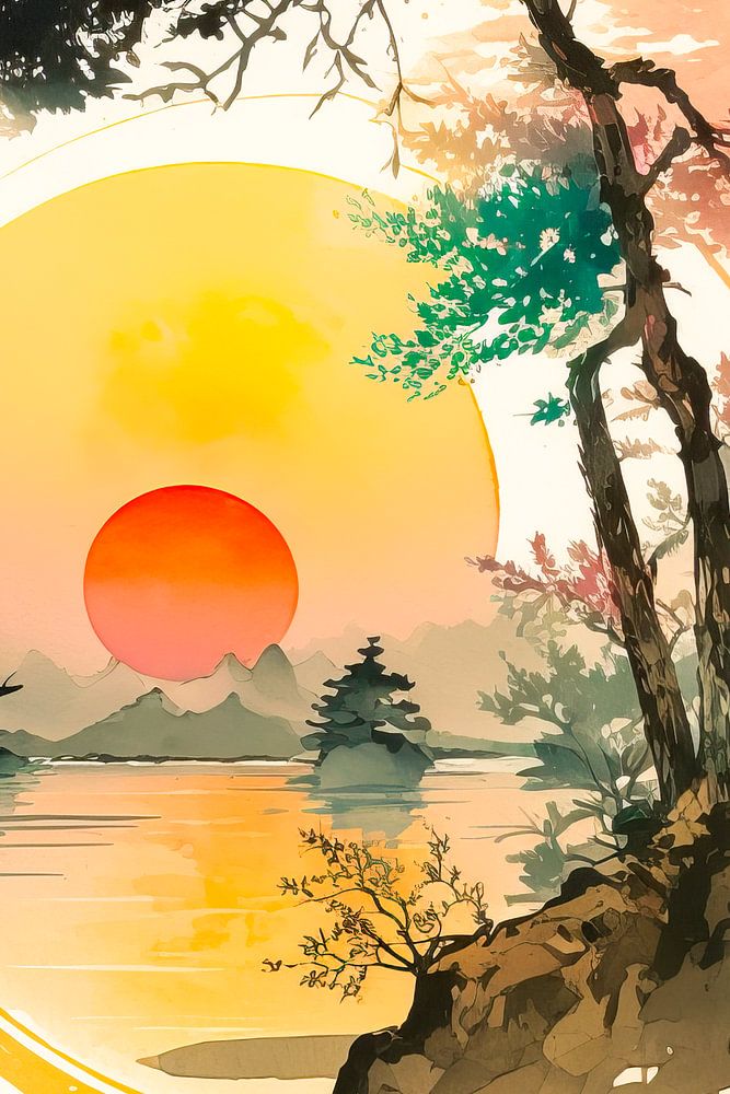 Eine japanische Naturlandschaft mit Bäumen, einem See oder einer Bucht, in der sich die aufgehende Sonne im Wasser spiegelt.