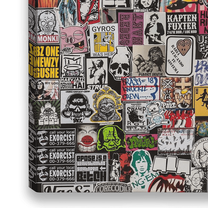 In der Stadt trifft man auf alles Mögliche, auch auf dieses Bild. Alle Arten von Aufklebern, die übereinander geklebt sind. Schön als Wanddekoration in einer städtischen Umgebung oder als Tapete gedruckt und eine Wand bedeckend.