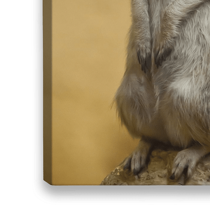Bestelle das Foto Aufmerksame süße Erdmännchen-Wert-Kolumne. Wachsames Erdmännchen auf gelb-orangem Hintergrund. Symbo von Michael Semenov als Reproduktion auf Leinwand, Alu-Dibond, als Poster, Fototapete oder Acrylglasbild.