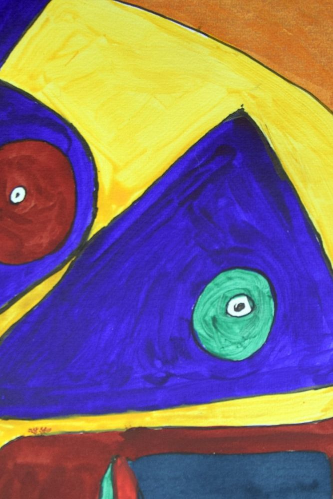Dieses lebendige Kunstwerk ist ein Spiel aus Farben und Formen, bei dem Abstraktion auf Fantasie trifft. Helle Gelb-, Rot-, Blau- und Grüntöne kontrastieren mit dunkleren Bereichen und schaffen eine dynamische Komposition, die in ständiger Bewegung zu sein scheint. Die organischen Formen erinnern an Augen und Gesichter und verleihen dem Werk eine geheimnisvolle, fast surreale Ausstrahlung.