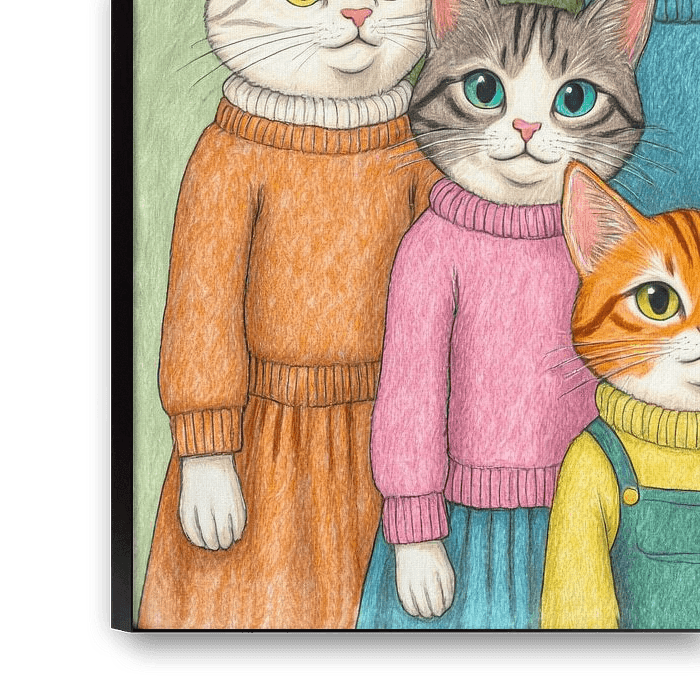Eine Gruppe von zehn Katzen steht zusammen, jede mit einem einzigartig gefärbten Pullover bekleidet. Ihre Gesichtsausdrücke und ihre Anordnung ergeben ein charmantes Porträt vor einem sanften grünen Hintergrund.