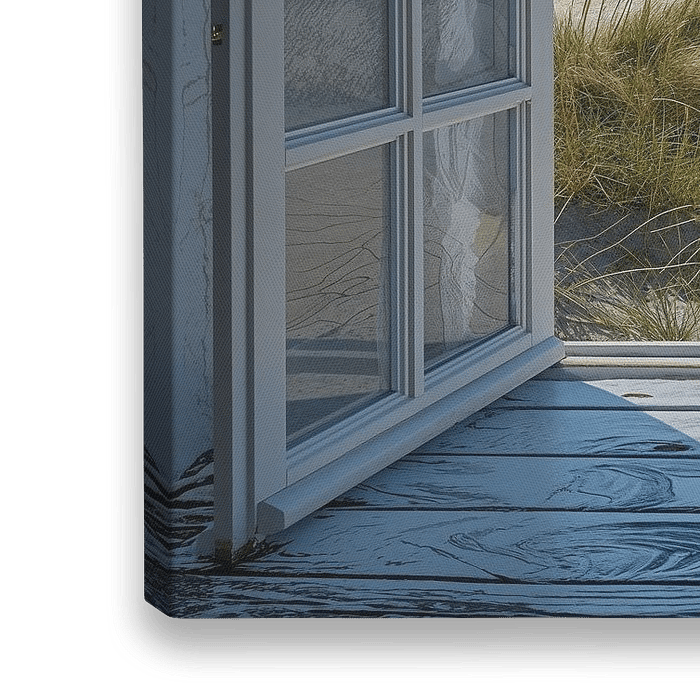 Ein offenes weißes Fenster mit Blick auf den sonnigen Strand, das Meer und den blauen Himmel.