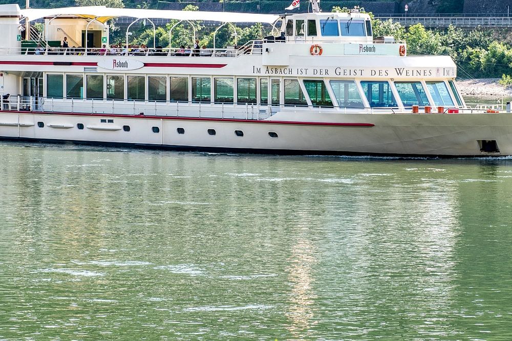 Das Asbach Uralt Ausflugsschiff für Tagesfahrten auf dem Rhein bei Koblenz. Asbach Uralt ist ein in Rüdesheim gebrannter deutscher Branntwein mit dem Werbeslogan: "Im Asbach ist der Geist des Weines". Dieser Slogan ist auf dem Schiff gut sichtbar.
