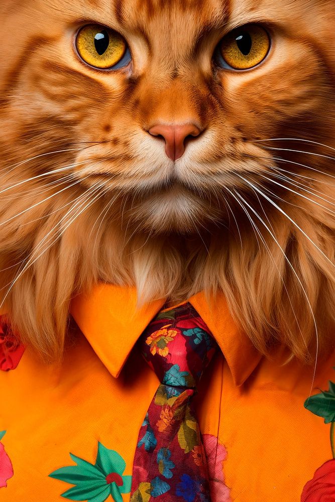 Eine majestätische Maine-Coon-Katze, gekleidet in ein leuchtend orangefarbenes Hemd mit buntem Blumenmuster und einer sorgfältig gebundenen, reich verzierten Krawatte, bereit zum Ausgehen. Kunst mit einem Augenzwinkern.