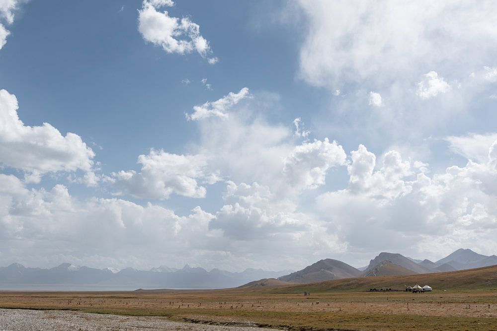 Ausgetrockneter Fluss mit losen Steinen und Jurten in der trockenen Ebene des Chatyr-Kul-Sees in Kirgisistan an der Grenze zu China.