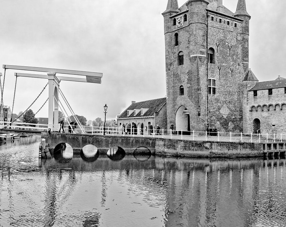 Ein wunderschöner Panorama Blick des Aussenhafens mit Stadttor von Zeerikzee in Schwarz Weiss