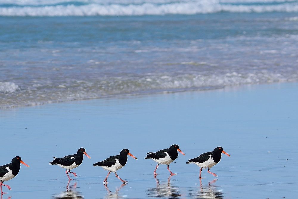 Auf unserer Fahrt zum Great Beach haben wir so viele verschiedene Vogelarten gesehen. Hier sehen wir Austernfischer, die dem Anführer am Cooloola Beach in Queensland, Australien, folgen.