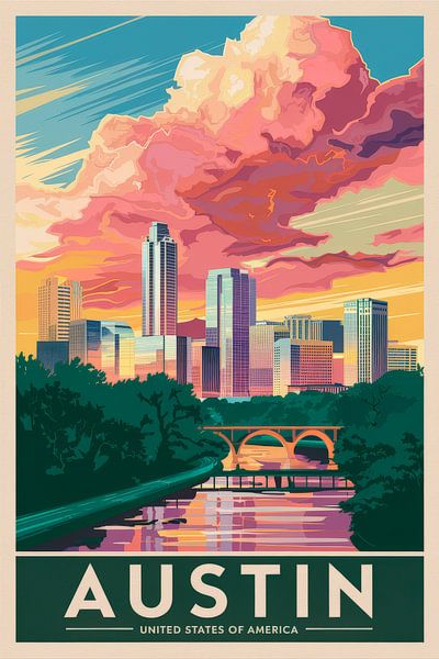 Bestelle dieses Landschafts-Wandbild Austin, Texas Vintage Travel Poster von Poster Art Shop als Reproduktion auf Leinwand, Alu-Dibond, als Poster, Fototapete oder Acrylglasbild.