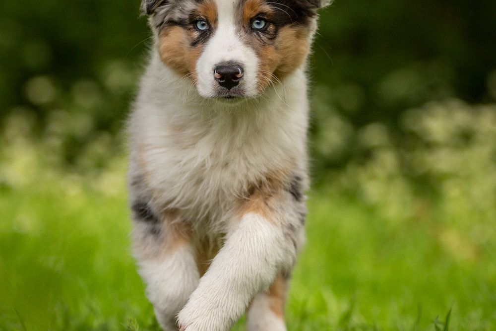 Welpe auf der Wiese. Australian Shepherd Welpe