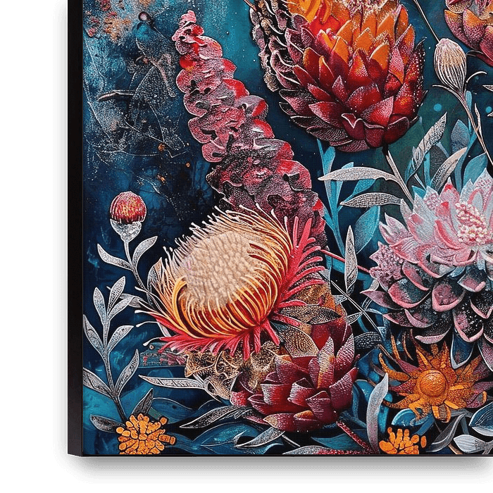 Ein Porträt australischer Wildblumen zeigt eine lebendige Mischung aus Farben und Formen, eingefangen in einer atemberaubenden Symphonie der Natur. Von den anmutig wogenden Kängurutatzen bis zu den farbenprächtigen Banksia's spiegelt jedes Detail die einzigartige Schönheit und Vielfalt der australischen Landschaft wider. Diese…