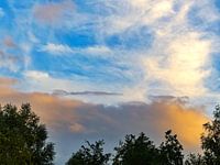 Am Horizont sind zwei verschiedene Wolkenschichten zu sehen, die von blau und weiß bis orange und grau reichen. Schwankende Bäume als schwarze Silhouetten unterstützen diesen magischen Moment