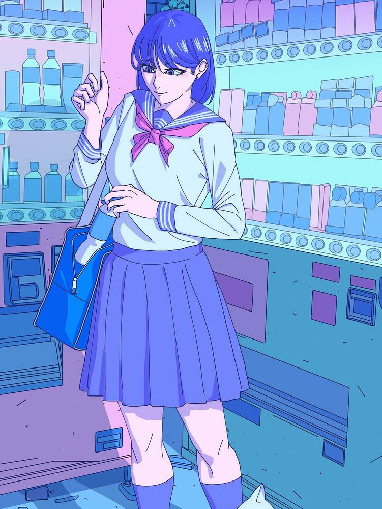 Eine verträumte nächtliche Szene, inspiriert von den ruhigen Straßen Tokios, wo sanftes Neonlicht über ein beschauliches Stadtviertel tanzt. Eine Schülerin steht neben einem leuchtenden Automaten und schafft einen friedlichen Moment inmitten der blauen und violetten Farbtöne der Nacht. Die umliegenden Gebäude, Kabel und Straßendetails…