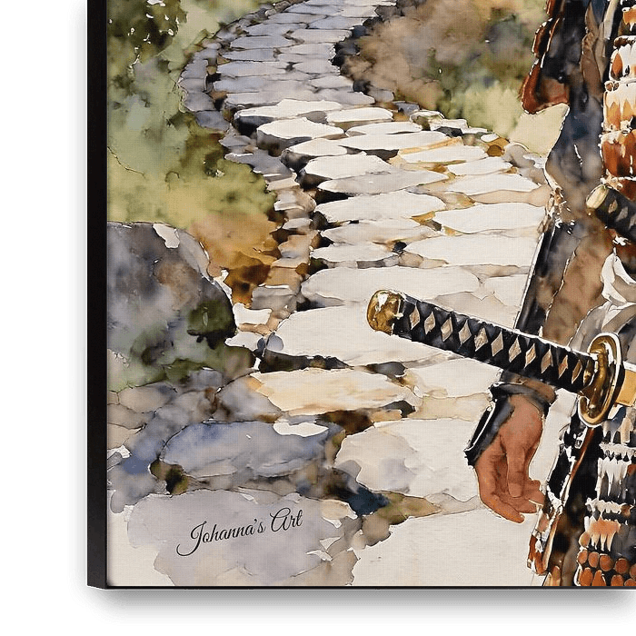 Ein Samurai-Krieger steht fest im Herzen eines heiteren Herbstwaldes und verkörpert Stärke und stille Wachsamkeit. Die Platten seiner traditionellen Rüstung schimmern in leuchtenden Blau- und Orangetönen, die mit dem goldenen und karminroten Laub um ihn herum sowohl kontrastieren als auch harmonieren. Jedes Detail seiner Rüstung - von…