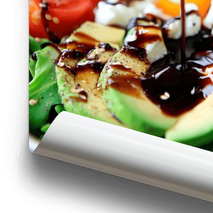 Farbexplosion aus frischem Grün und leuchtenden Tomaten, elegant gekrönt von einem schimmernden Balsamico-Dressing, das sanft auf die Avocado tropft. Diese appetitliche Komposition bringt Leben in jede Küche und inspiriert zu kulinarischen Genüssen, während sie gleichzeitig ein gesundes Lebensgefühl vermittelt. Ideal für den Esstisch…
