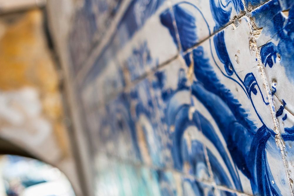 Engel auf Azulejo-Fliesen in einer Gasse in Lissabon, Portugal